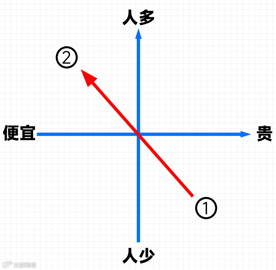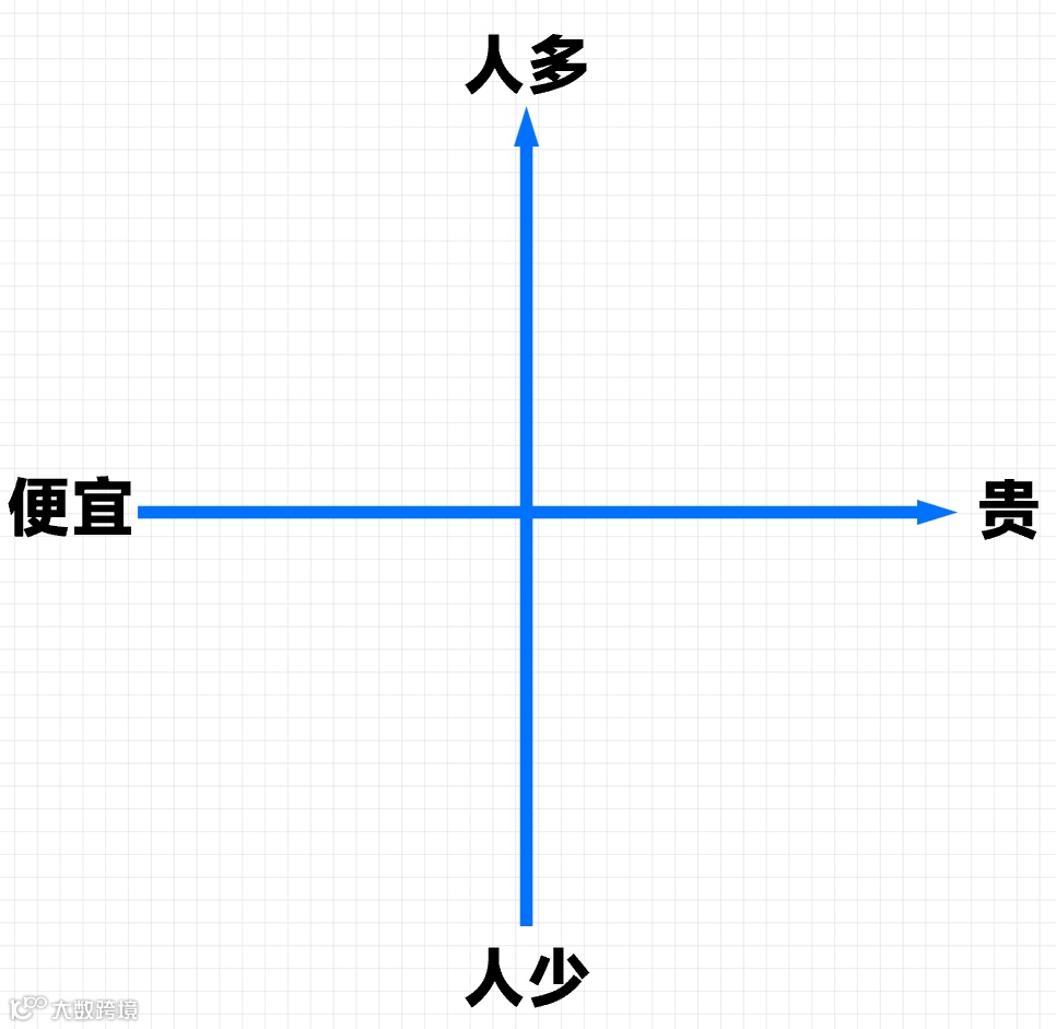 这样。你可以一边琢磨,一边拿纸笔写写画画,来理一理思路。现在,我们把“便宜、贵”作为横轴,“人少、人多”作为竖轴,画一个二维四象限图。