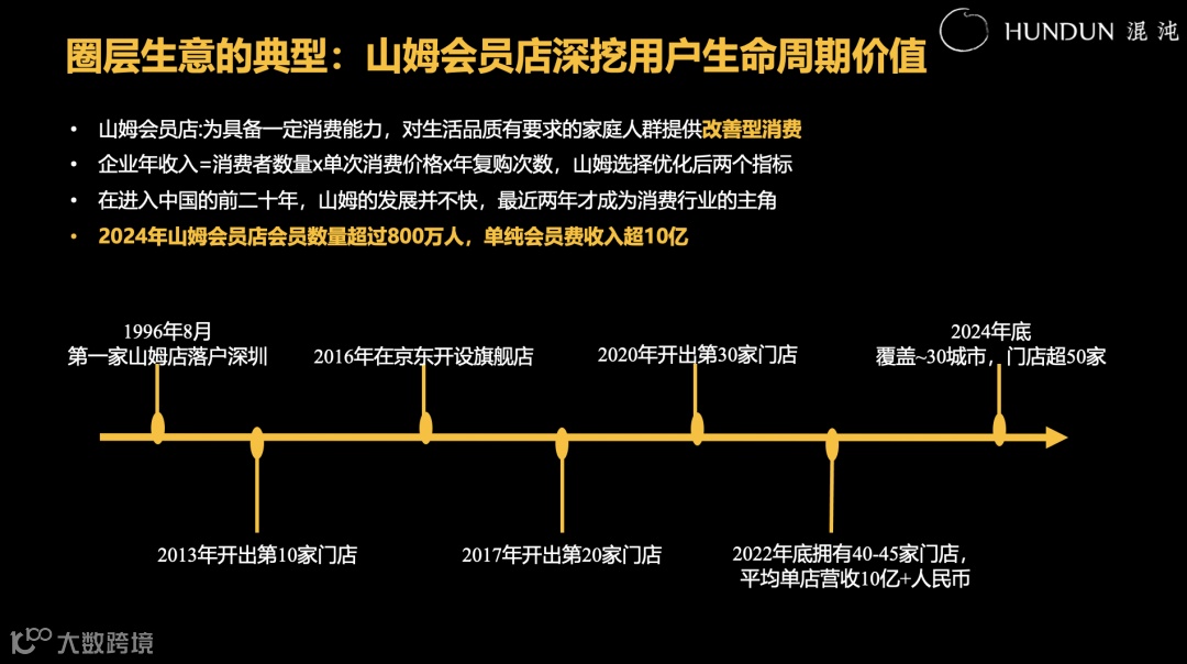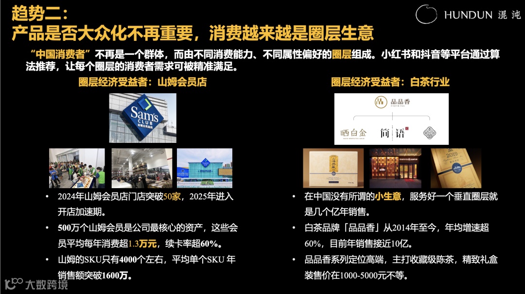我是一个消费投资人,擅长的更多是对于趋势的把握。为什么趋势如此重要?很简单,只有变化才有机会。 消费行业擅长培养百年老店,如宝洁、可口可乐等,这表明这些市场比较稳定,后来者难以超越。 就像日本有许多存在两三百年的企业,其实这样的百年老店能够产生主要是因为社会变化较慢,并非所谓的匠人精神。一个变化慢的社会容易培养百年老店,也容易产生匠人精神。 但如果社会变化快,大家能够不断去捕捉新变化,而且在变化面前,创业者与大公司往往是平起平坐的。所以,一旦有了变化,大公司抓不住,创业者能抓住的概率就会很高。所以,趋势分析的第一性原理就是找变化。 影响消费企业崛起的外部推动力有很多,比如内容、渠道带来的流量变化。当下大家似乎形成了一种共识,创业必须得有新的流量红利。如果没有抖音了,没有下一个流量平台了,就创不了业了。这个观点显然是不对的。 这种短期变化其实并不是创业最本质的事情。更值得关注的,是用户需求的变化。 消费品创业的本质在于服务用户需求,这是消费品行业的第一性原理。而不是等着渠道迭代。我希望能够带给大家的,更多是关于我们中国的消费者呈现出的变化趋势。 谈到具体的趋势,银发经济或许是中国未来十年的一个重要的长周期趋势。这跟人口的老龄化有关。老龄化的定义是65岁以上人口占整体人口的比例。目前,中国这一比例为15%,约2亿人。相比之下,日本的比例高达30%。 虽然目前中国的老龄化程度尚不严重,但老龄化的速度比过去的日本更快。根据行业研究和经济学家的共识,中国的老龄化人口从15%增长到30%所需时间将大约为15到20年,而日本用了30年。 我们今天对银发经济可能还没有那么强的感觉,但不远的将来我们就会发现老年人成为整个社会的消费主力军。 所以,我们未来的银发经济是一种怎样的景象,可以参照一下日本。 在日本,老年人是所有群体中消费能力最强的,因为他们通常拥有更多存款和金融资产,并且属于有房无贷一族,经济压力较小。这就是银发经济的机遇。 然而,消费能力强并不等同于消费意愿高。许多老年人花钱非常谨慎,这也是银发经济的一大挑战。 所以,什么样的消费业态能激发老年人的消费意愿?这是摆在非常多投资人和创业者面前的难题。银发经济被谈论许久,但大家一直找不到那个具体的项目的切入点。 但是这里有一群人,他们很厉害,很擅长激发老年人的消费意愿——骗子。为什么? 我们先看一个具体的案例,看看如何激发老年人的消费意愿。这是我投资的一个项目,长沙的“东茅街茶馆”,这是一个为老年人打造的第三空间。这是一个3000平米的大型茶馆,充满了湖南当地的文化特色。 与星巴克为商务人士提供社交场所类似,这家茶馆专注于老年人的社交需求。它为老年人提供了一个可以与朋友聊天、喝茶、吃饭甚至打牌的公共空间。 一些老年人每天都来,比热衷于尝鲜和打卡的年轻人要忠诚得多。因为老年人可以在这里找到归属感,满足情绪价值。 再往下分析,这背后是老年人退休之后,失去了社会身份,而个人的存在感的很大一部分来源是社会身份。这导致他们内心会比较孤独。他们需要成群结伴,进行社交和情感交流。 所以,情绪价值是激发老年人消费意愿的核心。为什么骗子总能骗到老年人钱,因为相比子女对长辈的说教,骗子能够轻松获取老年人的信任,就是因为他们懂得如何提供情绪价值。 中国消费趋势中的“圈层化”正在逐渐成为一个显著的现象。我们现在看中国消费,不会当做一个整体来看,如果单纯下论断说,中国人就是消费降级了,或者中国人怎样怎样,那肯定就是以偏概全。因为中国太大,圈层太多。 这两年,我们会发现胖东来变成了中国最受欢迎的一个商业现象和消费现象。这家位于河南四线城市许昌的企业,为什么能成为2024年的现象级商业案例?胖东来的成功有内部做得非常好的地方,这已经被很多人分析过了。 我想分享一个外部原因——时代趋势的原因,大家越来越意识到不是服务所有人才是好公司。 我认为胖东来的走红背后有一个时代的思潮的变化,这是一个非常本质的变化。一个企业,你把你的圈层服务得越好,把目标用户群服务得越好,那就是一个值得全国人民学习的企业。 胖东来存在了二三十年了,之前一直默默无闻。但是十年前,它做不到现在的影响力,媒体不会报道它,大家不会谈论它,因为那时候人们喜欢越大越好,关注的是覆盖面很广的大企业。 而今天,大家谈论的居然是一家河南四线城市的企业。“专注服务特定圈层”的商业模式逐渐受到认可。我觉得是时代的思潮,让胖东来走到了今天这个环节。 零售行业有两个企业呈现出这样的特征,一个是胖东来,一个就是山姆会员店。这家外企零售品牌在中国运营了近30年,仅开设了50家门店,目前在中国发展可谓是节节高升。 大部分的外企在中国已经过去了辉煌期,而山姆在2025年进入开店加速期。之前它都在养市场,都在服务它的核心圈层。 山姆会员店选择为具备一定消费能力,对生活品质有要求的家庭人群提供改善型消费。我们看到山姆的产品都是大包装,就是因为它针对的是有空间和消费能力的家庭用户。 山姆在2024年实现了接近1000亿元的收入,这背后有一个关键公式:消费者数量 × 单次消费价格 × 年复购次数 = 企业收入。 许多