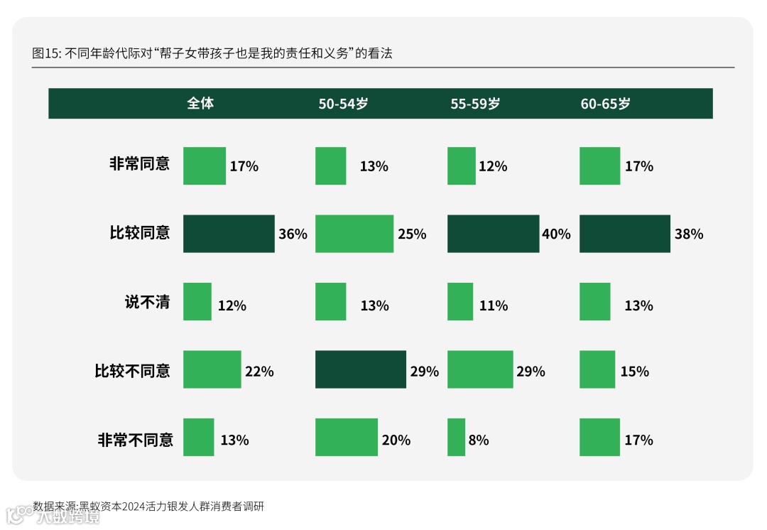 当被问及“帮子女带孩子是自己的责任与义务”时,55-59岁以及60-65岁的两组银发人群中少于四成的受访者表示“不同意”(包括比较不同意及非常不同意,下文一致),但在更为年轻的50-54岁银发人群中,不同意的比例占到49%。