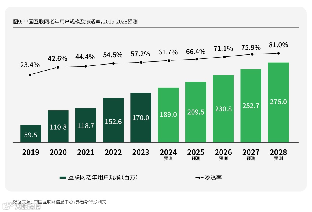 2023年末,我国互联网60岁以上老年用户规模达1.7亿,老年用户的互联网渗透率为57.2%,是2019年的2.44倍[6]。