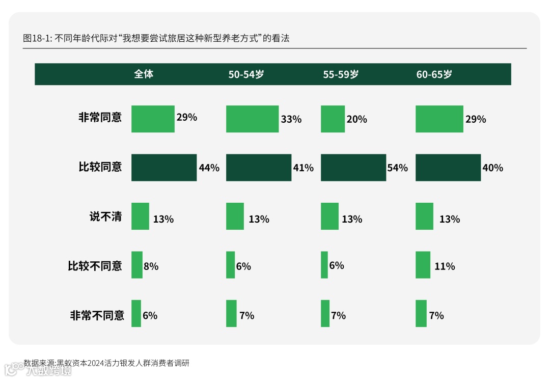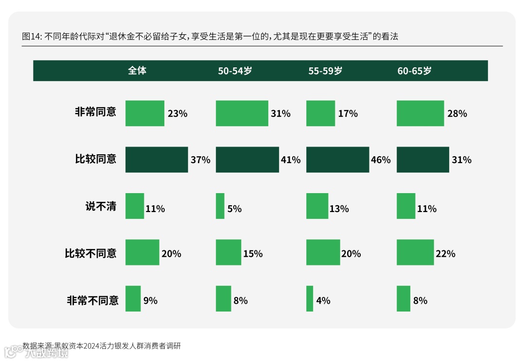 其中50-59岁的新银发人群,同意的比例较60-65岁人群更高。在50-54岁的受访者中,72%表示同意;55-59岁受访者中,63%表示同意;在60-65岁的受访者中,同意的比例为59%。