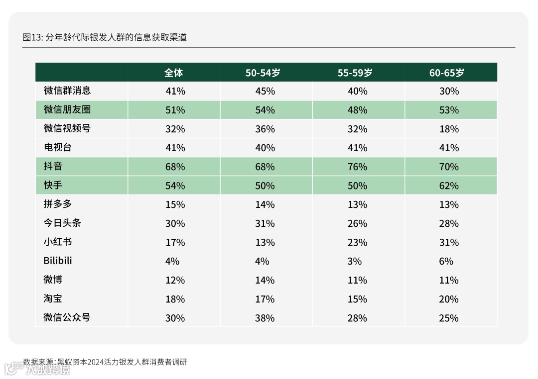根据此次《研究》发放的问卷反馈,在受访的50-65岁银发人群中,抖音已成为被提及最多的信息获取来源。