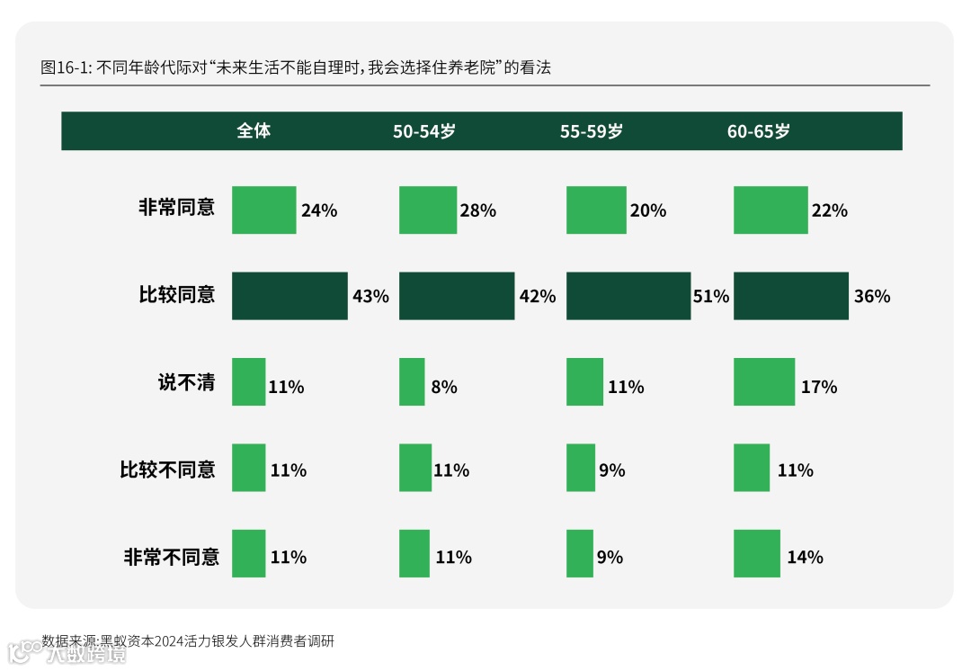 同意的比例在60-65岁银发人群中为58%。尽管存在一定代际差异,但能看到在不同年龄组里,超过半数的银发人群都表示同意,即生活不能自理时,会选择住养老院。