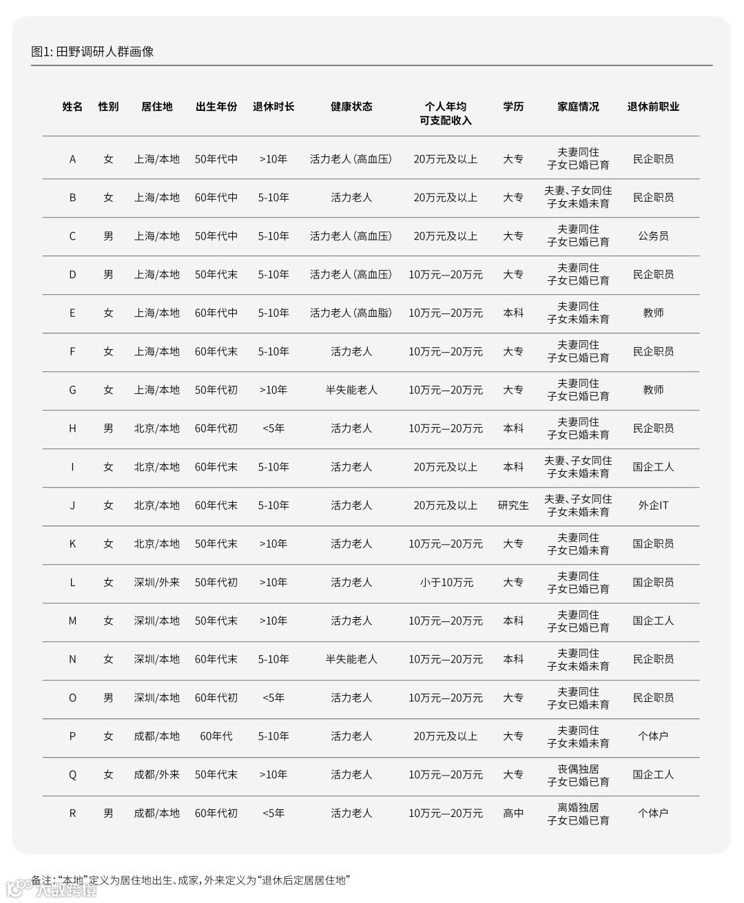 第一阶段是田野调研,从北、上、深、成都四个一线、新一线城市代表中筛选出共计18位有消费能力的50-65岁左右的活力银发人群(自有房产、个人月均可支配收入6,000元以上)进行田野访谈,了解被访者的个人经历、退休生活状态、日常消费和时间规划,并从中挖掘新老代际银发人群在养老和消费理念上的差异,洞察消费的共性需求和趋势。