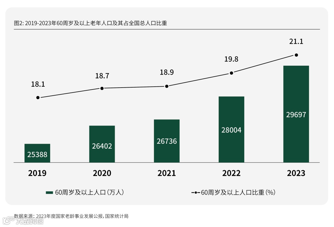 2024年10月11日,民政部、全国老龄办发布《2023年度国家老龄事业发展公报》,截至2023年末,全国60周岁及以上老年人口29,697万人,占总人口的21.1%;全国65周岁及以上老年人口21,676万人,占总人口的15.4%。
