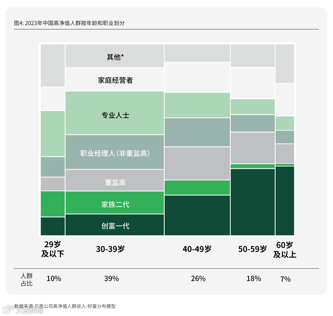 此外,根据招商银行和贝恩公司2023年联合发布的《2023中国私人财富报告》,在中国个人可投资资产在人民币1,000万元以上的高净值人士中,以家庭经营者和创富一代为主体的50-59岁年龄段占比为18%,远超占比7%的60岁及以上年龄段。