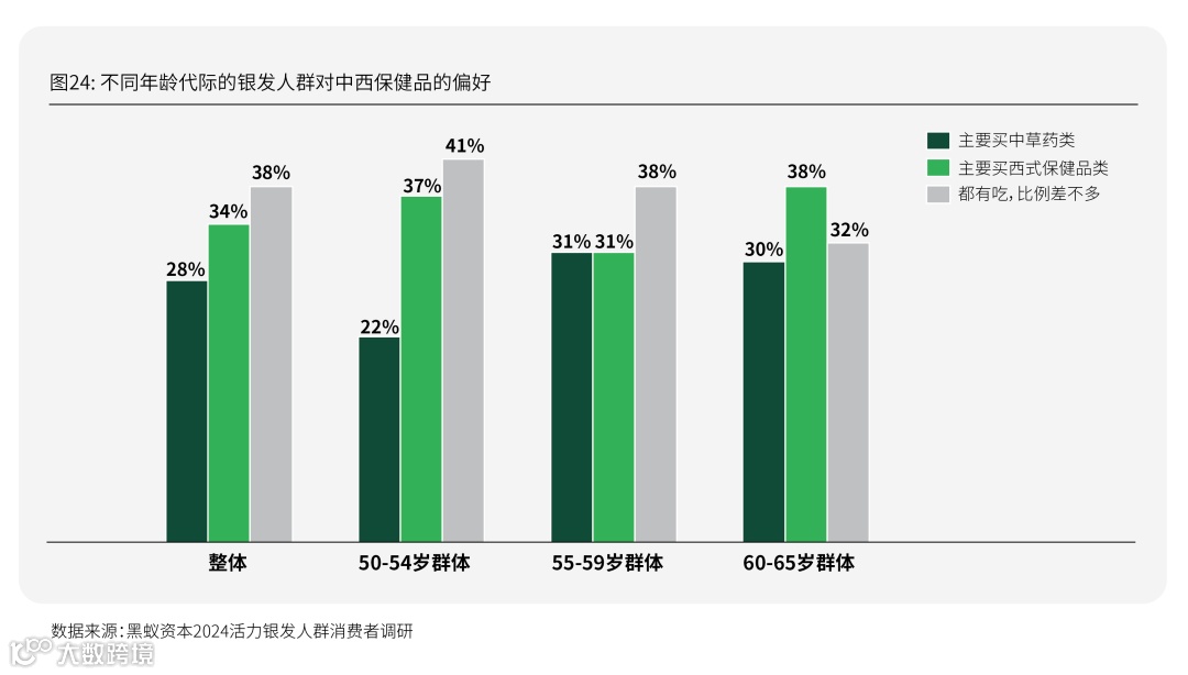 本次定量和田野研究对象在保健食品消费的渗透率达到100%,整体来看38%的银发人群共同使用中草药类滋补品和西式保健品,34%的银发人群绝大部分服用西式保健品,28%的银发人群绝大部分服用中草药类滋补品,他们普遍诉求西医以精准补给,诉求中医以渐进调养。