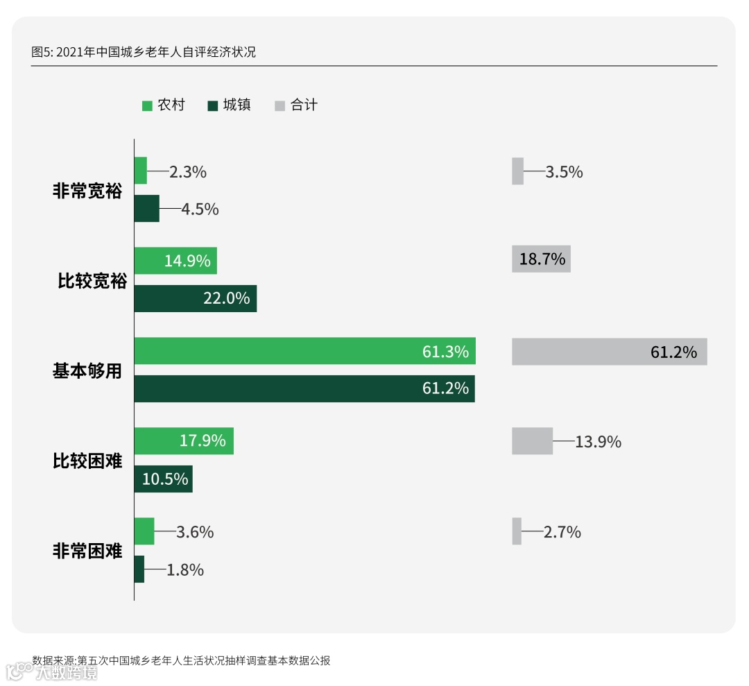 从自评经济状况来看,认为非常宽裕的老年人占3.5%,比较宽裕的占18.7%,基本够用的占61.2%。