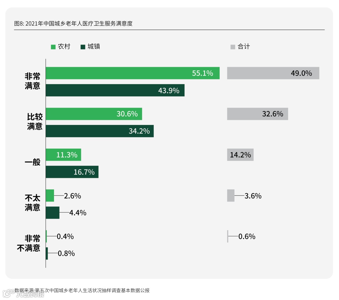 按照《2023年我国卫生健康事业发展统计公报》数据,2021年我国老年人对医疗卫生服务表示非常满意以及比较满意的占比高达81.6%。