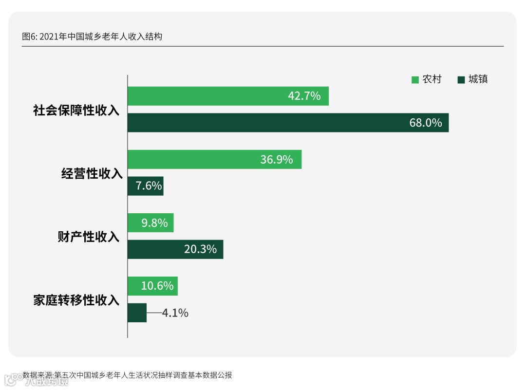 在各项收入贡献度方面,城镇与乡村存在一定相似与差异——城镇老年人以社会保障性收入(68%)与财产性收入(20.3%)为主,农村老年人以社会保障性收入(42.7%)与经营性收入(36.9%)为主,且家庭转移性收入的占比(10.6%)在农村老年人中更大。