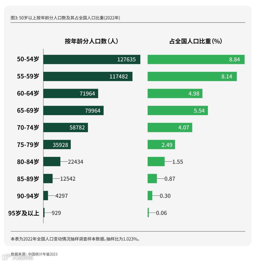 依据本次研究目的及范围,银发人群的年龄范围限制在50-65岁。根据《中国统计年鉴2023》,截至2022年年末,我国50-64岁人口规模达31,708万人,占总人口比重达21.96%。