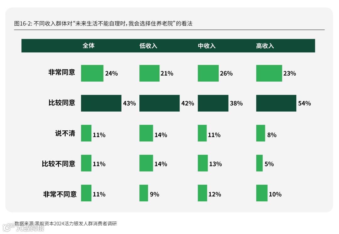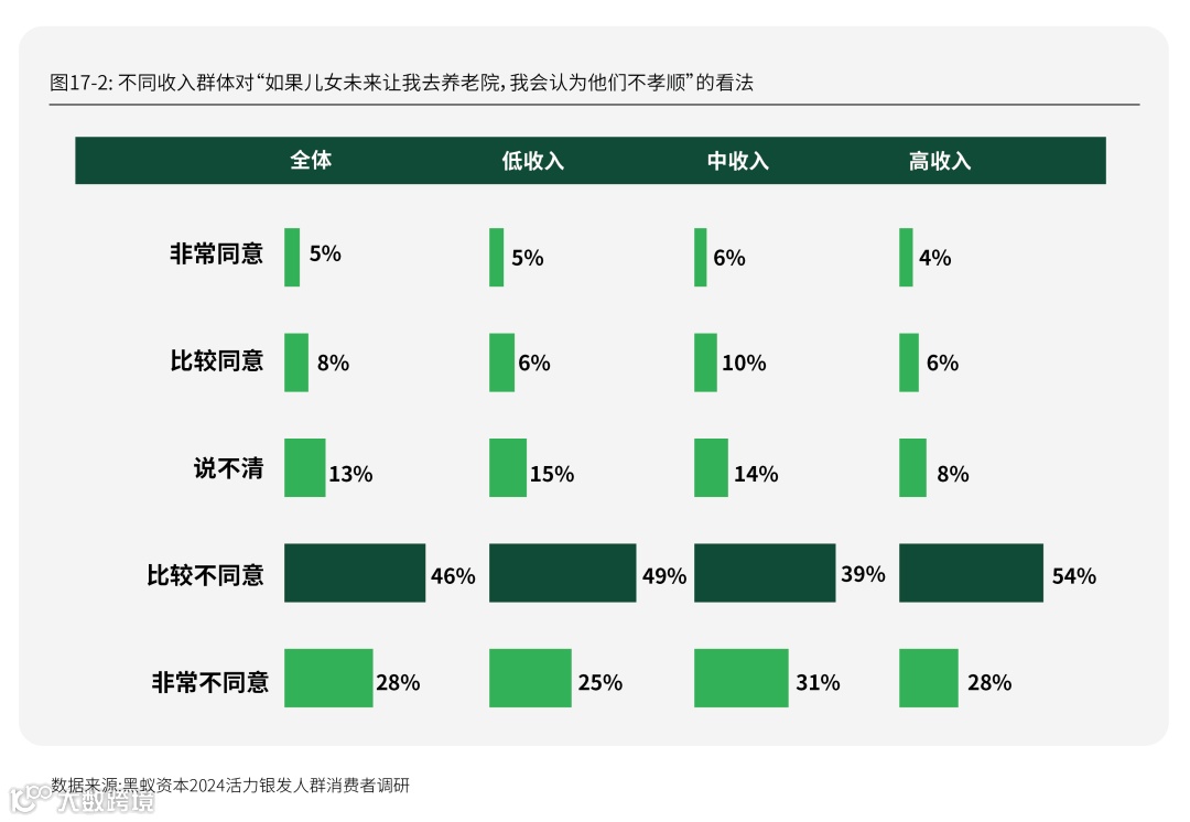 在调研银发人群对养老院的态度持开放或传统时,此次定量调研结果显示,代际差异与收入差异都影响着银发人群对养老院的态度:更年轻或收入更高的银发人群对养老院持更开放的态度。