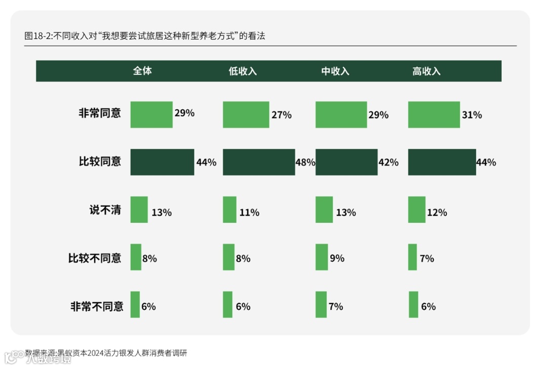 定量调研结果同样显示,对于如旅居等更为新型的养老方式的态度,约7成的受访者都表示愿意尝试,而代际差异与收入差异对结果没有显著影响。
