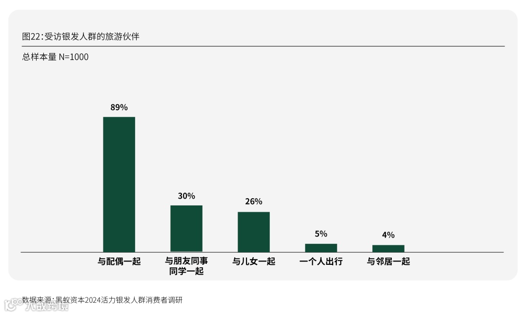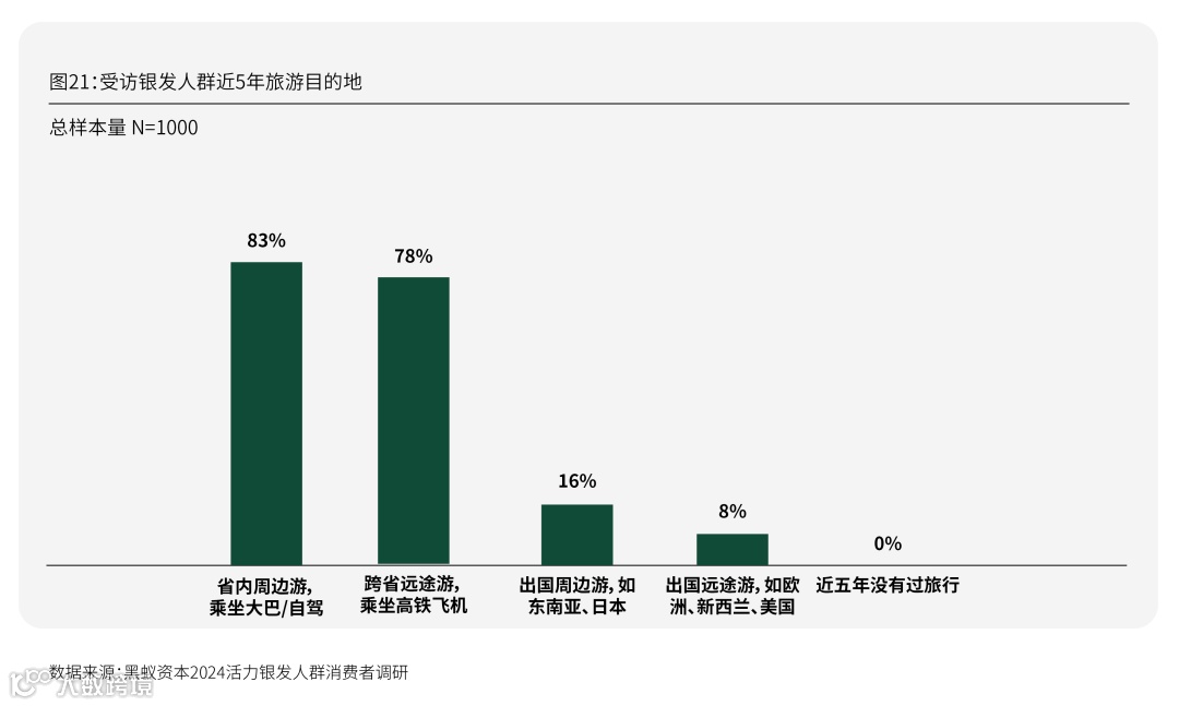 旅行成为新银发最主要的生活娱乐方式。此次定量结果显示,100%受访银发人群近5年均有过省内、省外或国际旅行经验,其中省内周边游(83%)和跨省远途游(78%)为主流,多数情况是与配偶共同出游。