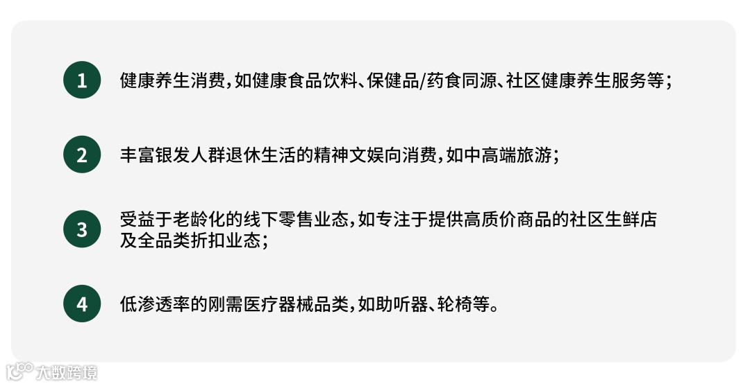 《研究》尝试从需求角度出发,提出一些产业发展机会。《研究》认为,有四类产业受益于银发人群的扩大、消费力的释放和互联网在该人群中的渗透提升。