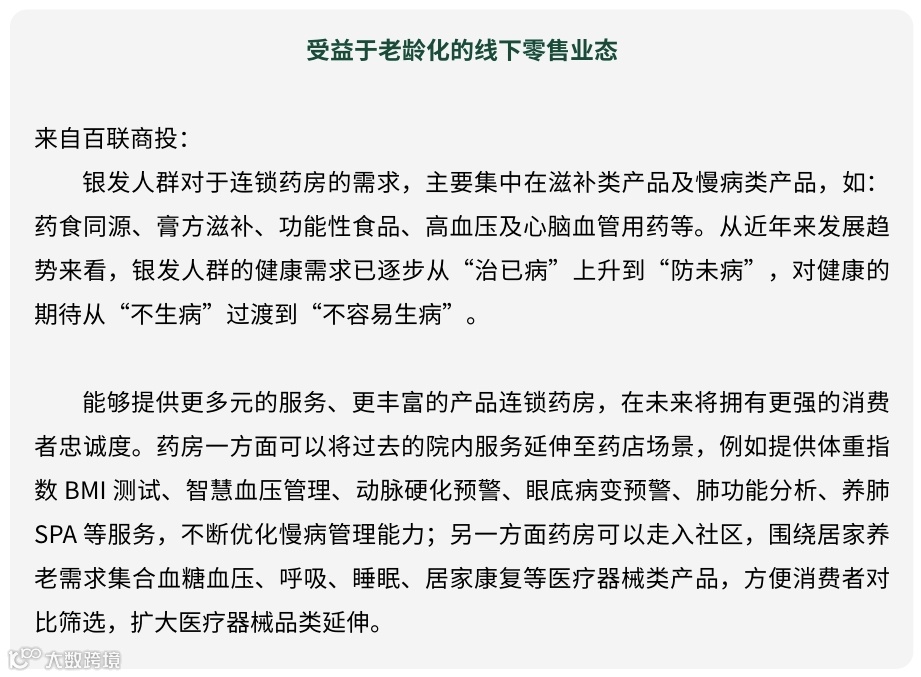 3)受益于老龄化的线下零售业态,如专注于提供高质价商品的社区生鲜店及全品类折扣业态;