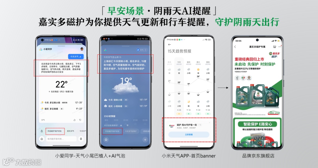 比如在早安场景中,特别是阴雨天,嘉实多磁护为消费者提供天气更新和行车提醒,守护阴雨天出行;