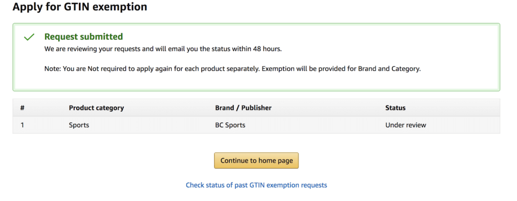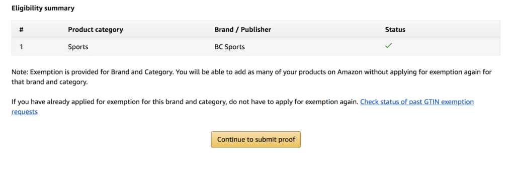 如果该品牌名称符合亚马逊 GTIN 豁免条件,您将在状态下看到绿色复选标记,并且可以继续提交证明。