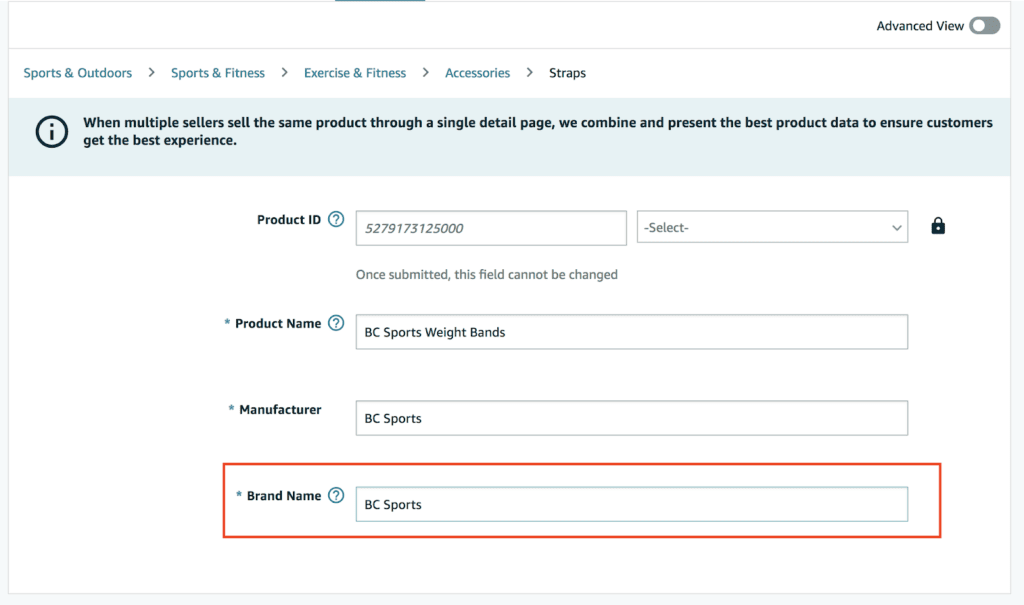 输入您的产品名称(这将是您列表中的标题)、制造商(您可以输入与品牌名称相同的名称)以及与提交 GTIN 豁免时完全相同的品牌名称。自从我获得 BC Sports 的批准后,我就进入了 BC Sports。
