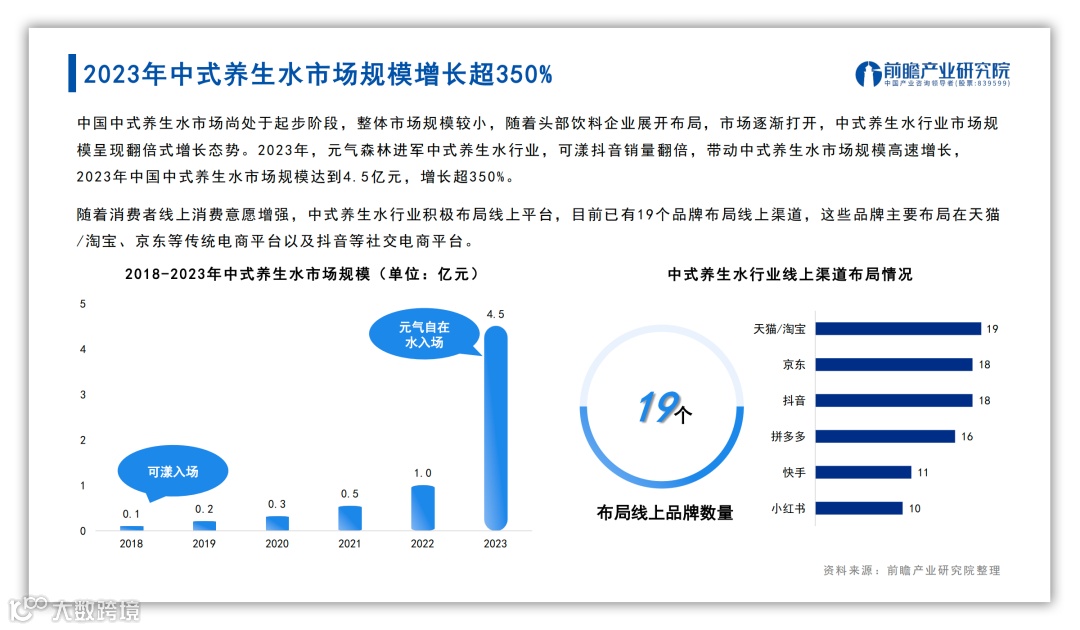 早上八段锦,下午养生水,晚上饭后散散步,睡前按按摩......小红书上,惜命的年轻人分享养生生活的热帖越来越多。 随着全民健康意识的不断提高,越来越多的年轻人开始关注自己的身心健康,根据小红书平台数据显示,2023年10月至2024年3月期间,与“养生”有关的内容互动热量超过2400万。 新中式养生具有深厚的理论基础,它所倡导的“天人合一”“阴阳调和”等理念与现代人追求自然和谐的生活态度相契合,且养生方法多样,既有适合办公室白领练习的简单动作,也有适合全年龄段的太极拳、八段锦等。 这种灵活性使得不同年龄层、不同职业的人都能找到适合自己的养生方式。因此,新中式养生以其独特的理论体系和方法,逐渐受到越来越多群体的青睐。 此外,惊蛰研究所在中曾提到,随着中式养生热潮的兴起,越来越多的年轻人开始使用与之相关的养生产品,或是订购健身养生专业课程,市面上的中式养生产业逐渐发展得更加全面和成熟。 一些太极拳馆和武道馆会开设八段锦体验课,主要适用零基础入门的消费群体,主打养生调理和体验传统文化,面向的群体是亚健康、三高人群,单次收费价格在50元到200元不等,全套一对一私教课收费在1000元到2000元之间。 一些专业的中医诊疗也增加了养生咨询和线下的养生课程培训。同时,市场上也出现了越来越多的高端养生产品,如高端中药饮片、高端保健品、高端养生度假村等,满足了部分消费者对高品质养生产品的需求。 在现制茶饮行业以及便利店商超,以天然草本植物、水果或药材为原料,通过煮制、萃取等工艺制成的“中式养生水”也开始刷存在感。 根据前瞻产业研究院发布的《2024年中国中式养生水行业发展趋势洞察报告》显示,2023年中国中式养生水市场规模达到4.5亿元,同比增长超过350%,预计至2028年可达到破百亿元规模。 可以看到,在快节奏的现代生活中,如今的年轻一代开始回归传统生活方式,探索符合自身文化背景的养生之道。“新中式养生”的出现也意味着传统与现代并不矛盾,而是可以相辅相成。