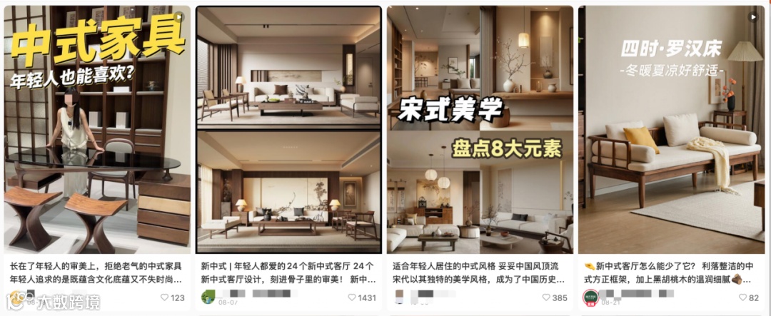 家居市场也是“新中式”消费风潮发展最为自然的领域。 根据千瓜数据的调查显示,2023年“新中式家居”的流量持续增长,在小红书的相关种草笔记数增长超63%,月均互动达百万级,新中式家具市场也在不断成熟,除了木质家具外,其他品类如“壁纸、地毯、床垫”等品类的种草笔记数或互动量增长也超300%。 新中式家居风格的第一大特点是展现了文化的传承,不是纯粹的元素堆砌,而是对传统元素的再创造。 惊蛰研究所注意到,相较于传统中式风格中繁琐雕花所营造的老气氛围,新中式风格更倾向于简洁明快的线条,例如对沙发、床、餐桌等家具的边角处理更为圆润,减少了复杂的雕刻装饰,使家具看起来更加利落,因此受到年轻人欢迎。 此外,不少消费者在新中式装修中既注重整体装修效果的同时,也关注小物件的场景搭配,如在床头两侧设置风格相同的灯具、在书桌上放置文房四宝和线香,在几案上摆放花瓶器物,以此来营造东方特有的禅意。 根据天猫的数据,新中式家居热销商品中的华流元素包括陶瓷、博古架、花瓶、盆景、假山、珐琅石等。 可以说,新中式家具正以其别具一格的风格满足当代人对家居生活的多重需求。富有东方韵味的造型设计,与现代家居风格相得益彰。同时,实用性的提升也使得这类家居广受追捧。 可以预见,随着消费者对传统文化认同度的不断提高,新中式家居必将成为家居市场的宠儿。