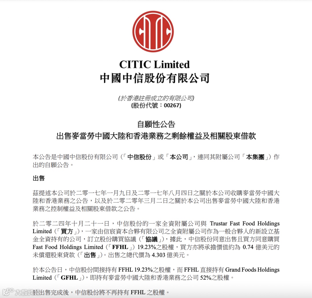 正冲击万店目标的麦当劳中国迎来了新投资人。 今天,中信资本控股有限公司(下称:中信资本)宣布,旗下私募股权投资业务信宸资本与中信股份签订协议,收购中信股份持有的麦当劳中国内地、香港及澳门业务(下称”麦当劳中国”)股份。 交易后,中信资本联合体(包括中信资本及其旗下私募股权投资业务信宸资本)仍为麦当劳中国的控股股东。 值得注意的是,在中信资本联合体保留最大股东地位的同时,其也为麦当劳中国引进了新股东。 来自卖家中信股份今天发布的公告显示,买家为一家由信宸资本的全资附属公司作为一般合伙人的新设立基金全资持有的公司,但未透露新基金的其他合伙人身份。 而在今年2月,市场曾传言有多家主权财富基金洽谈投资麦当劳中国。 在今天回复小食代查询时,麦当劳中国表示,此次交易将进一步简化其股权结构。其“更强大、更智慧、更美好”达到10000家餐厅的发展愿景不变,将在股东的支持下继续推动公司未来的发展。 此外,另据小食代刚刚看到麦当劳中国对员工就此事的沟通函,麦当劳中国董事会的主席与副主席人选均不变,又指展望未来,中信资本和麦当劳全球将继续提供坚定的支持。 通过本次交易,中信系在麦当劳中国的股份,将从中信股份及中信资本同时持有,变成中信资本一家持股。 资料显示,,中信股份和中信资本入股麦当劳中国,与其他股东一起积极推动麦当劳在中国内地和香港的业务的发展。,中信股份将部分麦当劳中国股权转让给中信资本,此次交易为再度转让。 根据上述公告,此次交易标的为Fast Food Holdings Limited(下称:FFHL)19.23%股权,也就是中信股份间接持有的所有FFHL股权,相当于麦当劳中国近10%的股权。 包括价值约为0.74亿美元的未偿还股东贷款在内,出售总代价为4.303亿美元(约合人民币30.56亿元)。 目前,FFHL直接持有Grand Foods Holdings Limited,即持有麦当劳中国大陆和香港业务之公司52%之股权。出售完成后,中信股份将不再持有FFHL股权。 尽管如此,交易后,麦当劳中国的第一大股东仍为中信系企业,后者交易前拥有52%麦当劳中国股份,交易后保留控股权。一方面,这意味着,在此次收购中,麦当劳中国新投资者获得的是少数股权。 彭博今年2月曾引述“消息人士”称,穆巴达拉投资公司(Mubadala)、卡塔尔投资局和中投公司正在洽谈以少数股东的身份联合投资麦当劳中国。 中信资本未透露新投资人身份。目前,麦当劳中国的董事会安排也还没确定。 另一方面,麦当劳中国未来仍能得到中信系的能力加持。 中信资本指出,未来,在中信资本联合体的控股下,其将与其他股东继续坚定支持麦当劳中国的发展战略。 麦当劳中国将继续得到中信集团在金融、地产等多个领域的协同资源支持,加速在市场拓展门店布局优化以及运营效率提升等方面的进程。就资源共享和业务合作而言,中信集团与麦当劳中国之间仍有广阔的合作空间。 “过去几年,我们与中信股份密切配合,共同助力麦当劳中国的快速发展,在业务拓展和可持续发展等各方面均取得了令人瞩目的成绩,赢得了投资人、消费者的广泛认可。”中信资本董事长兼首席执行官、麦当劳中国董事会主席张懿宸在一份通报中指出。 麦当劳中国回复小食代称,此次交易将进一步简化该公司股权结构。 “我们很高兴看到,基于对中国经济与消费市场增长前景以及麦当劳中国发展潜力的坚定看好,中信资本旗下私募股权投资业务信宸资本加码麦当劳中国。”麦当劳中国称。 几乎同时,小食代了解到麦当劳中国对员工就此事也发出了沟通函。 沟通函指出,衷心感谢中信股份在过去7年中为其提供的资源和战略支持,“我们对中国经济与消费市场的前景坚定看好,也对麦当劳中国未来的发展潜力充满信心”。 上述沟通函进一步指出,对麦当劳中国,中信资本联合体将继续在金融服务、地产和其他业务提供支持,也会积极与中信集团的业务网络进行协同,帮助麦当劳中国在未来的市场竞争中占据优势。 据介绍,张懿宸和Jo Sempels将继续担任麦当劳中国董事会的主席与副主席。 中信股份则在公告中表示,本次出售是基于该集团业务发展策略,为集团提供良好投资回报,符合集团利益。 此次转让也是有关麦当劳中国股权的再次变动。 目前,麦当劳中国由中信、麦当劳全球持股,持股比例分别为52%、48%。其中,的48%股权包含了今年初从凯雷处接手的20%股份。 事实上,麦当劳中国确实在短短几年内变成了更具吸引力的资产。由于后者并未上市,其无需主动对外披露财务情况,但交易官宣前的一则公示令外界得以从侧面了解其家底。 就在上月初,北京产权交易所公示了此次交易的有关通知。该产权转让项目为《Fast Food Holdings Limited 250股股份(占总股本的19.23%)及相关债权》,转让标的所属行业为餐饮业,转让底价约29.71亿元。 上述的Fast Food Holdings Limited即中信系持股麦当劳中国的主体,持股比例为52%。根据上述公示,2023年,Fast Food Holdings Limited营业收入为418.76亿元,营业利润为21.14亿元,净利润15.04亿元。 截至2024年6月30日的财务报表显示,该集团营业收入为219.07亿元,营业利润为9.005亿元,净利润6.2亿元。 公告提到,该项目转让底价为297,119.11万元,其中股权的转让底价为245,061.42万元,转让方对标的企业57444.8718万元港币债权的转让底价为52,057.69万元。 回顾2020年,约22%麦当劳中国股权的转让底价为21.