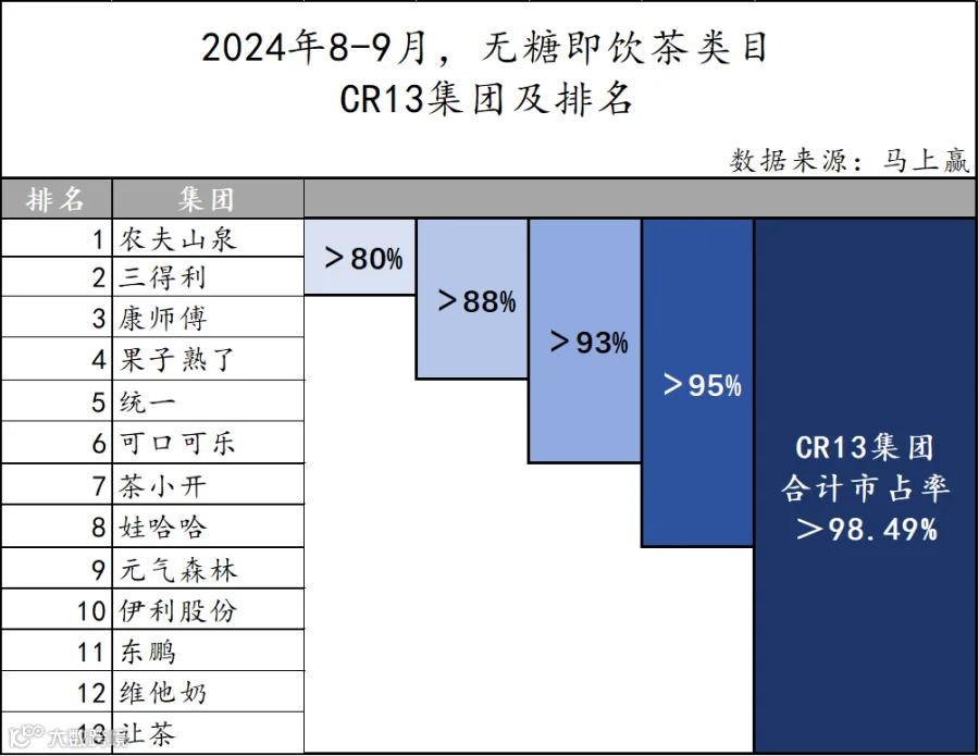 具体到头部集团的变化上,无糖即饮茶类目在2024年8-9月的品牌集中度延续了4-7月的走势,CR13集团超过98.49%的市占率相较于上一观察周期保持了小幅度增长。