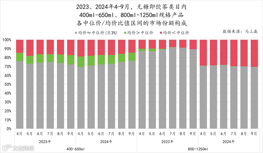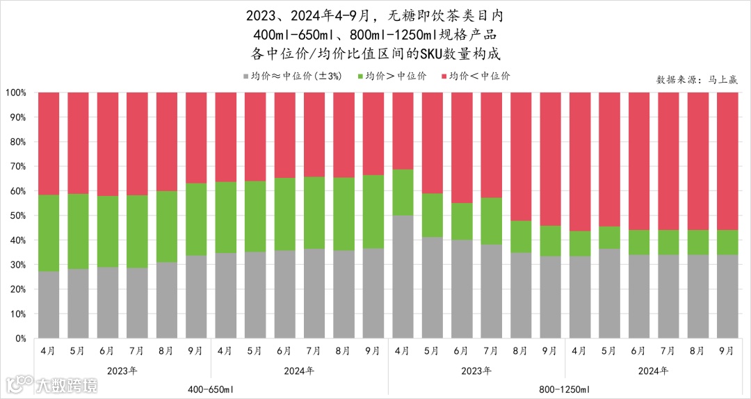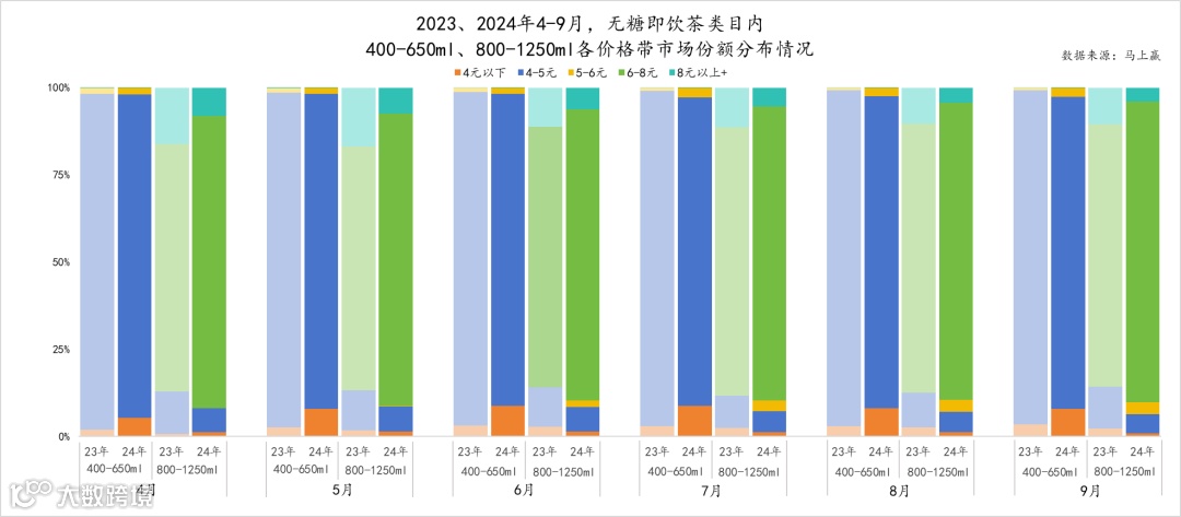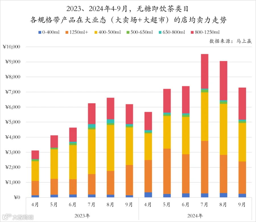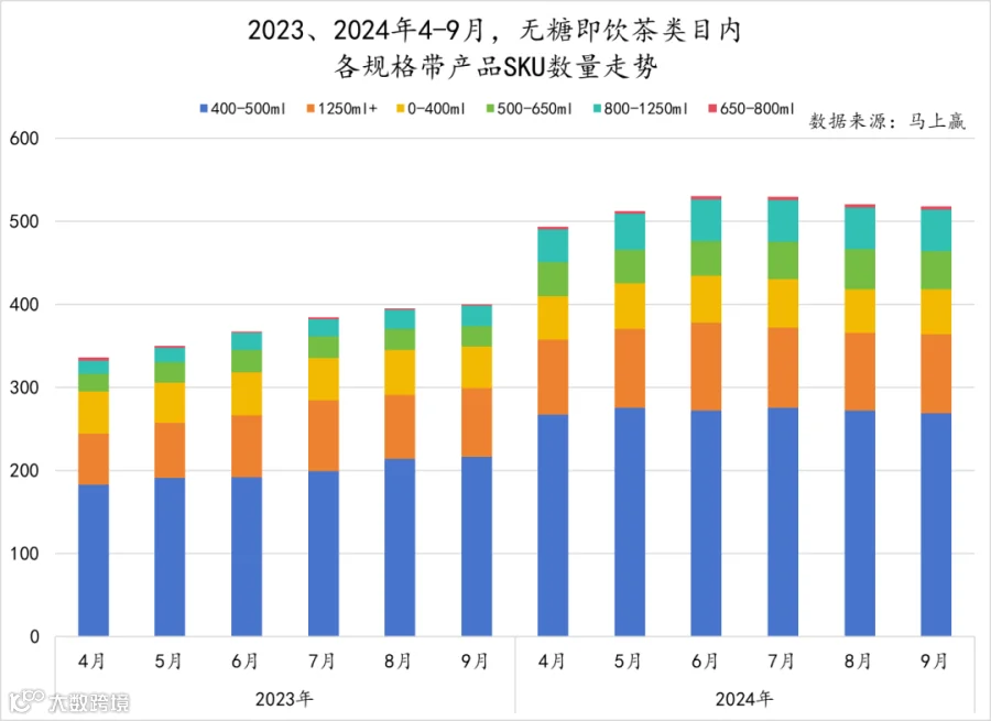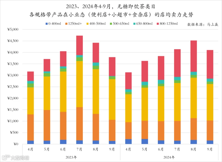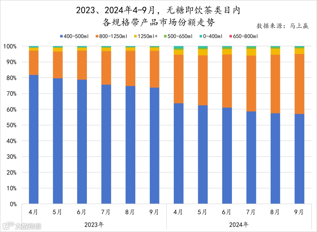 按照规格带划分来观察其市场份额占比,一方面可以发现400-500ml的常规规格产品在2024年的4-9月均占据了60%左右的市场份额,符合消费者对饮品便携性等的要求;