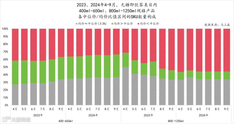 首先来观察各区间的市场份额构成,可以发现在400-650ml规格带内,总体价盘较为稳定,70%以上处在均价≈中位价区间内。