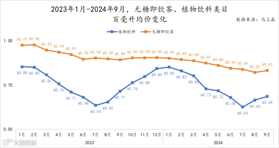 对植物饮料价格的分析,我们选取了百毫升均价作为切入点。尽管无糖即饮茶的百毫升均价从2023年开始便整体呈现下降趋势,但仍未探下0.8元。