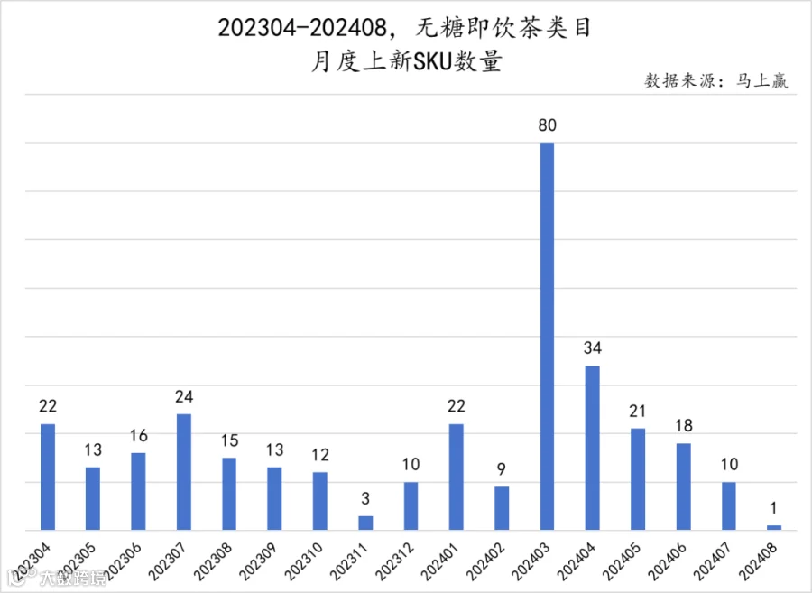 在对新品数量变动的观察中,我们发现从2023年4月至2024年8月,无糖即饮茶类目内的新品数量在2024年3、4月迎来了一次爆发,3月的新品数量更是达到了80款,远远超出之前新品数量的规模。