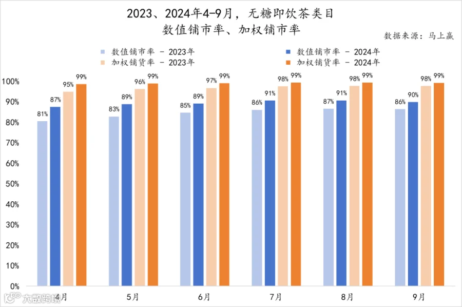 无糖即饮茶类目的铺市率在2024年4-9月的进展并不算大。尽管其数值铺市率分别有4-6%的小幅增长,但整体已达到90%左右的水平,加权铺市率更是在2024年均已达到99%,接近顶峰。