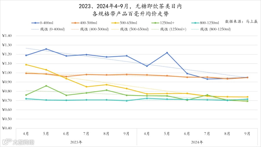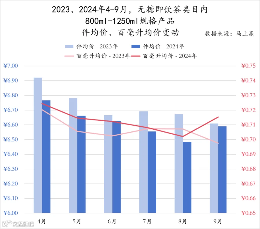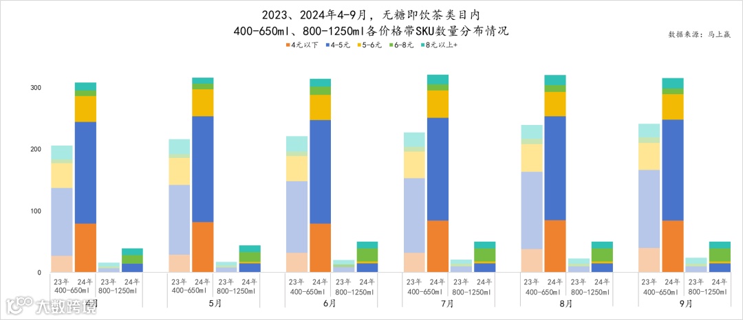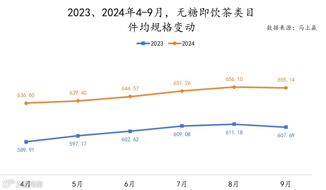 能够最直接呈现无糖即饮茶类目内规格走势的便是件均规格变动情况。可以看到,2024年4-9月无糖即饮茶类目件均规格同比2023年基本上增加了40ml左右,“量”的提升之势显而易见。