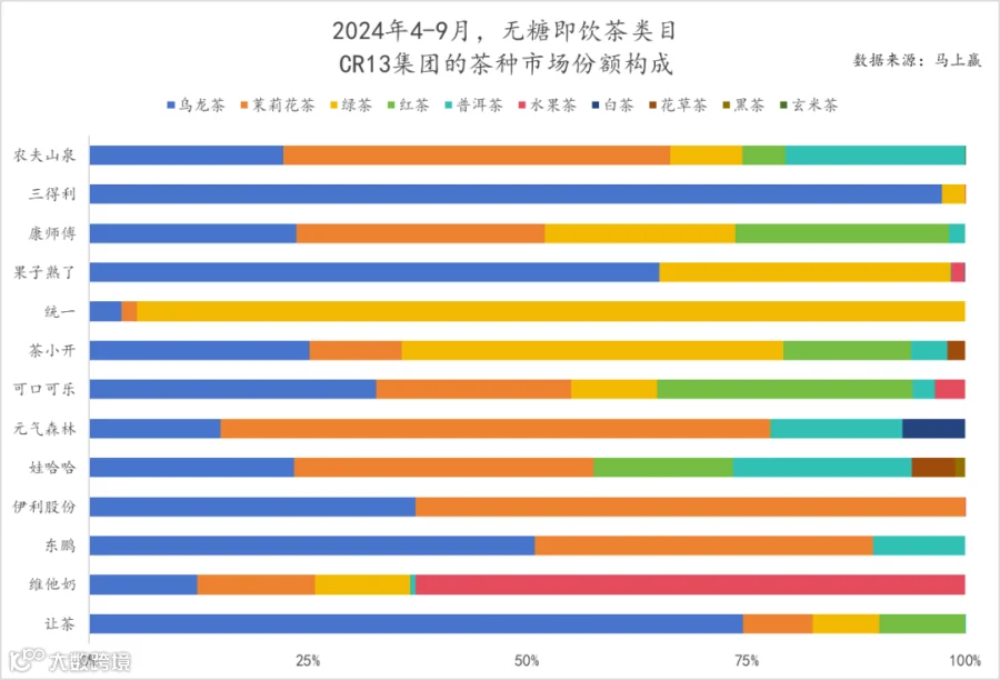 结合上述茶种与集团茶种分布,以及无糖即饮茶类目整体的市场份额构成情况可以看到,无糖即饮茶的前两大茶种--茉莉与乌龙,其市场构成方式完全不同,茉莉是一两家独大,虽然头部集团都有涉及但其实市场份额占比并不高,主要依赖领头羊的推动。