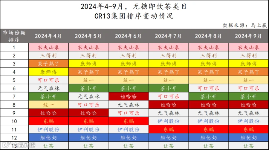 纵观整个2024年4-9月的CR13集团排名变化,可以看到:头部第一名的农夫山泉、第二名的三得利,以及尾部的维他奶、让茶,都是4-9月没有名次变化的,主要的名次变化集中在3-11位之间。