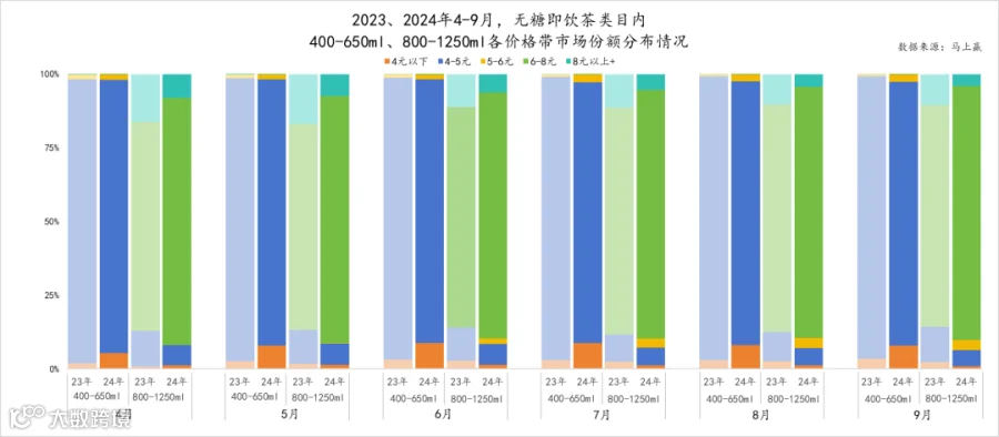 在这一部分,我们将从价格、规格、茶种、业态、地区、城市等级、新品情况等角度,基于2024年4-9月及同比2023年4-9月,无糖即饮茶类目内的各种属性的变化,来观察类目内正在发生的改变。
