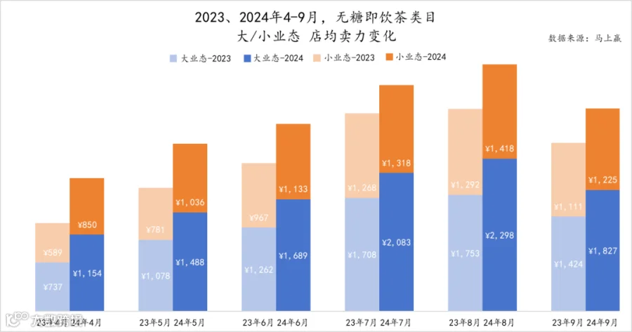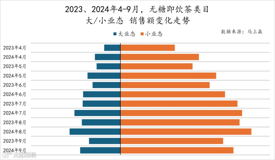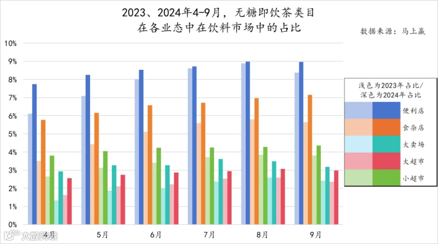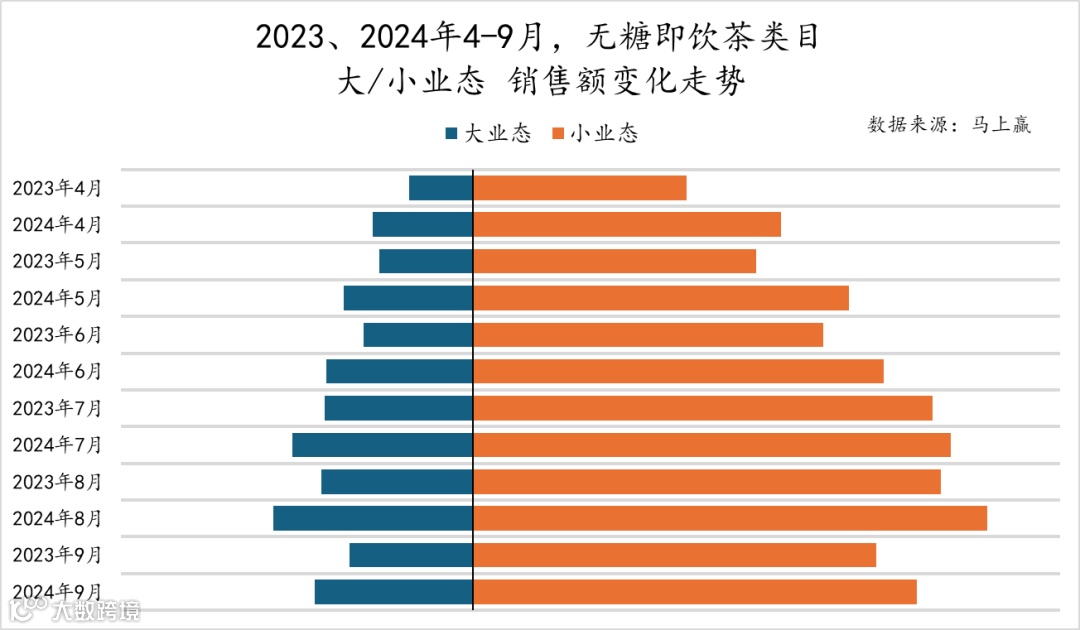分大、小业态来看销售额的变化情况,基于马上赢品牌CT中的连续门店数据来看,小业态仍旧是无糖即饮茶类目的最重要阵地,同比来看其销售额在4-9月均有明显增长。而大业态的销售额占比虽整体偏低,但同比来看其增长幅度略高于小业态的销售额增长。