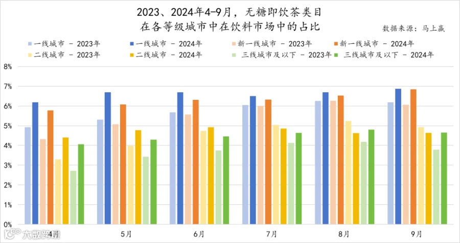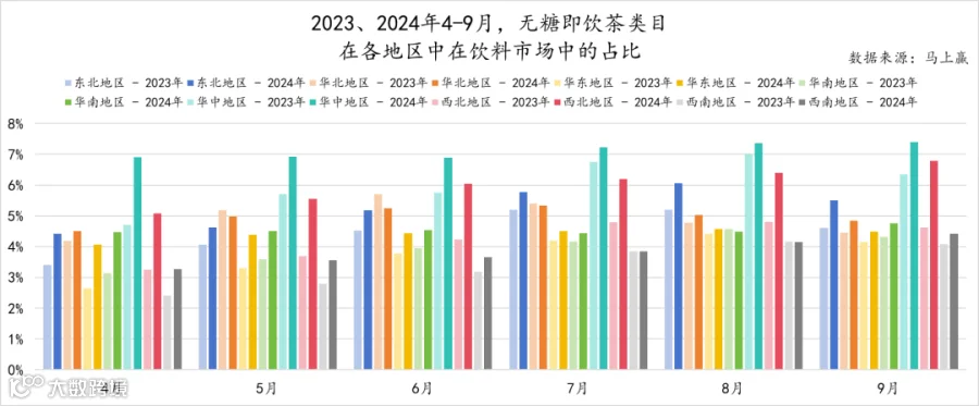 但在西北地区内,无糖即饮茶的市场份额同比、环比增速均更为迅猛,2024年9月已经接近7%。