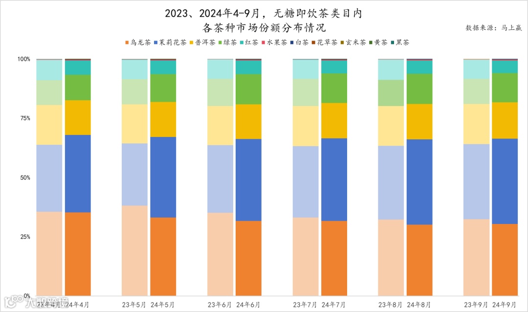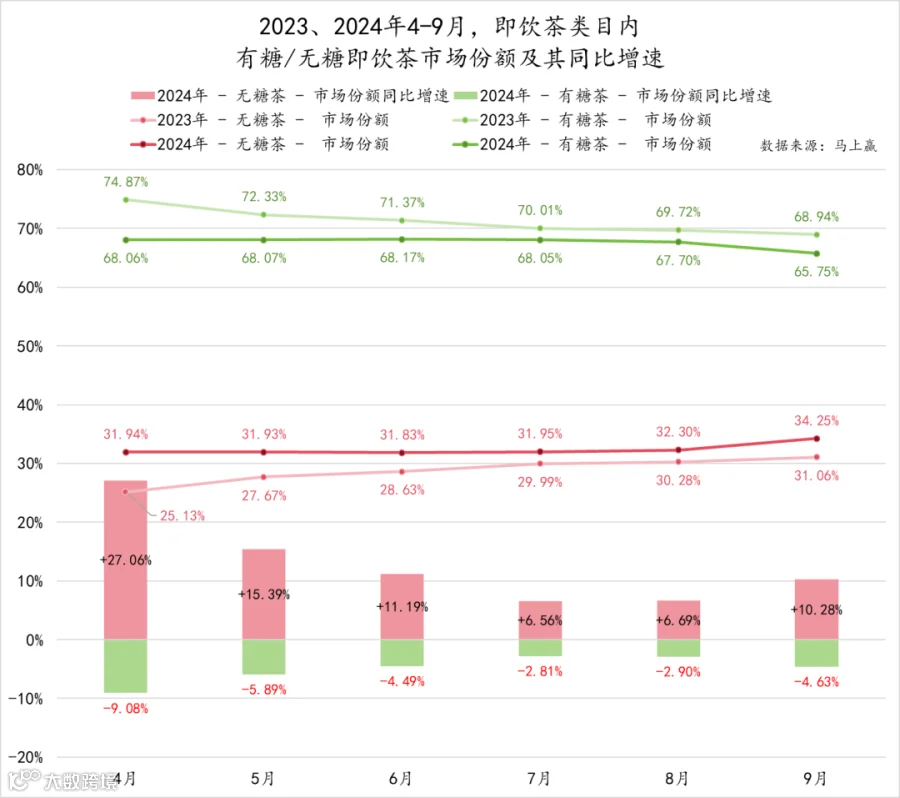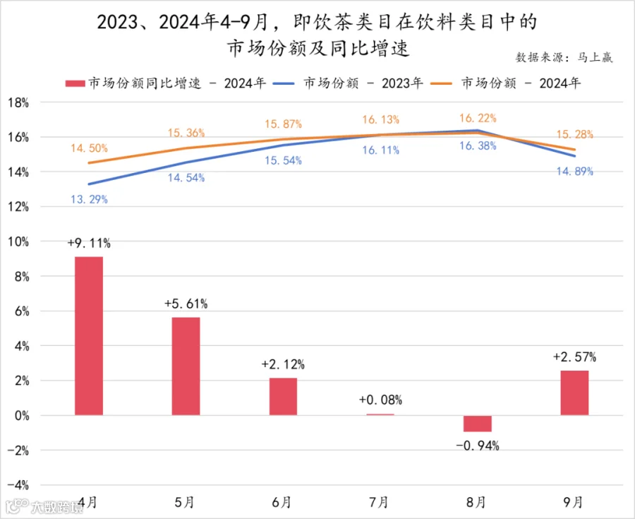 可以看到,随着即饮茶类目中的无糖即饮茶在饮料市场中持续发力,2024年4-9月该类目的市场份额同比基本高于2023年同一时期,尤其是4、5两月的份额更是与2023年拉开明显差距。