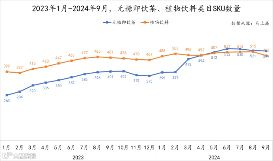 出乎意料的是,当下市场份额并不算高的植物饮料类目内,SKU数量规模却颇为庞大,甚至在2024年3月之前一直比无糖即饮茶类目下SKU数量更多一些。在绝对值较高的同时,植物饮料类目下SKU仍有一定程度的增长。