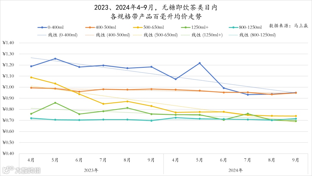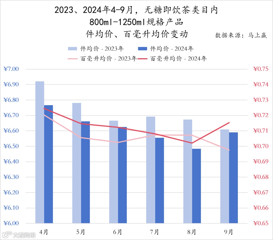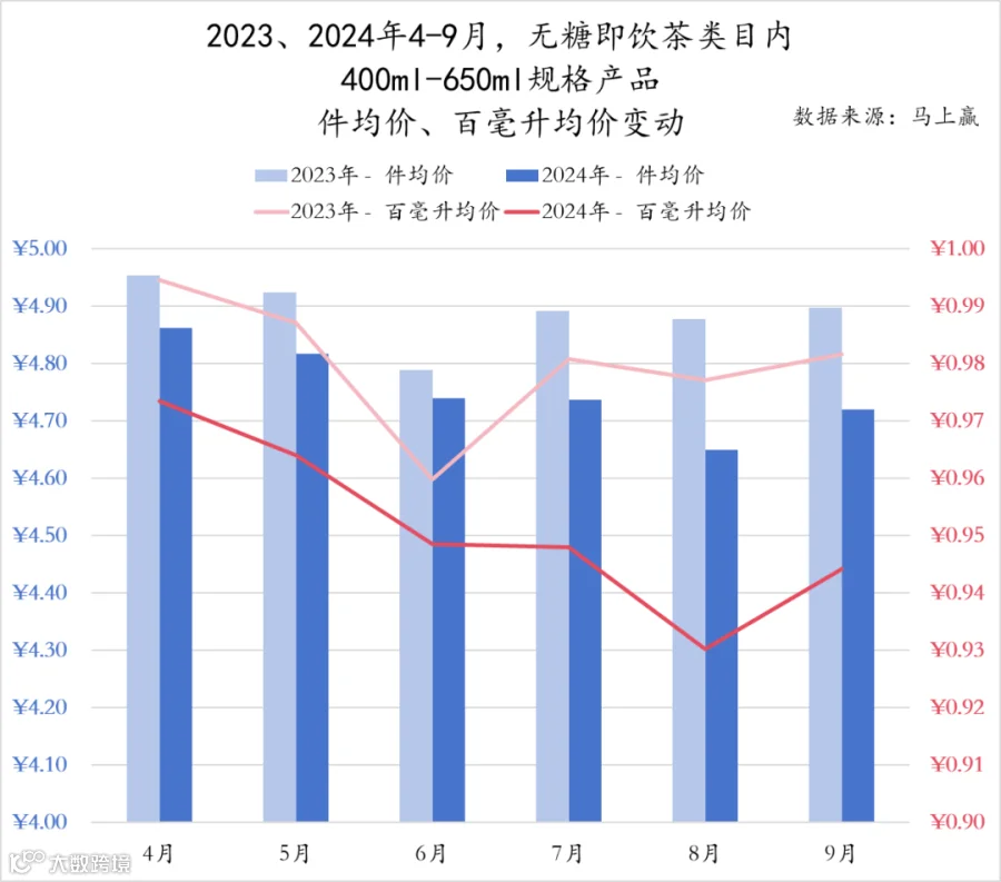 在400-650ml规格带范围内,件均价与百毫升均价同比来看均有幅度不小的下降。可以看到,百毫升均价的明显下跌带来了件均价整体的降低,2024年4-9月无糖即饮茶产品的件均价与2023年同期相差较大。