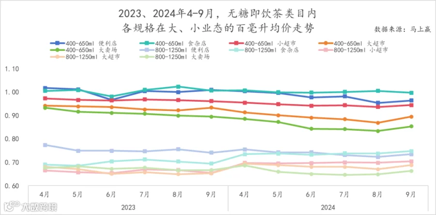 结合规格带划分看大、小业态内无糖即饮茶类目的百毫升均价走势,最直观的发现是400-650ml产品的百毫升均价在不同业态内均明显高于800-1250ml。