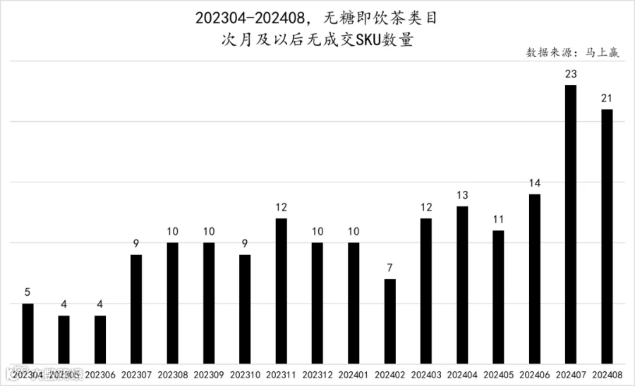 图中可见,在2024年3月之前,无糖即饮茶类目中在次月消失的SKU数基本保持在10款以内,但从2024年3月以后,这一数据便再未回落至10以下,并且持续走高。