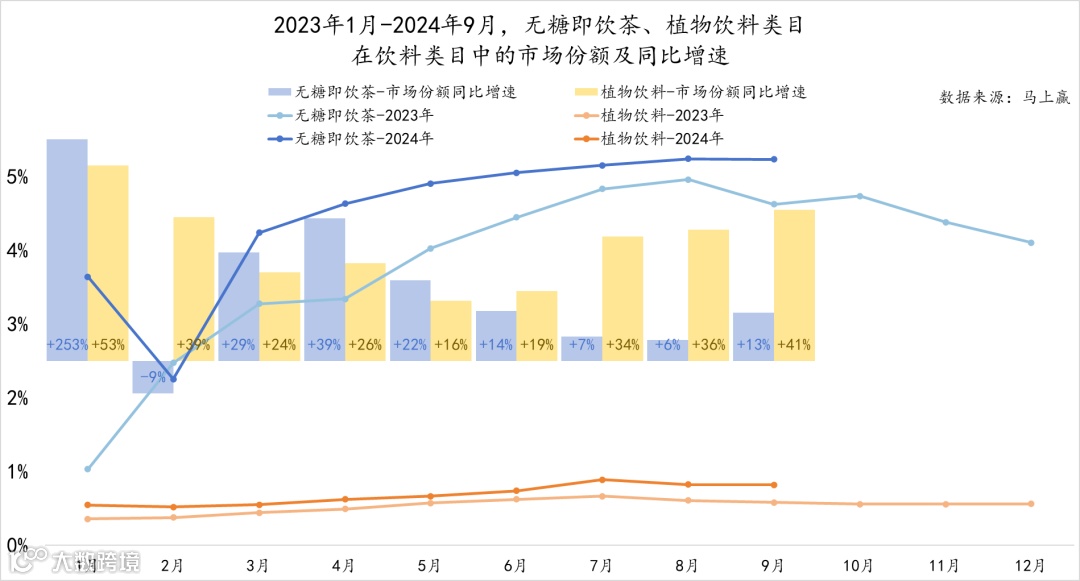 考虑到春节在2023年、2024年所在月份不同,对市场造成影响错位的因素,观察2023年3月-2024年9月二者的市场份额可以看到,无糖即饮茶5%左右的占比远高于植物饮料。