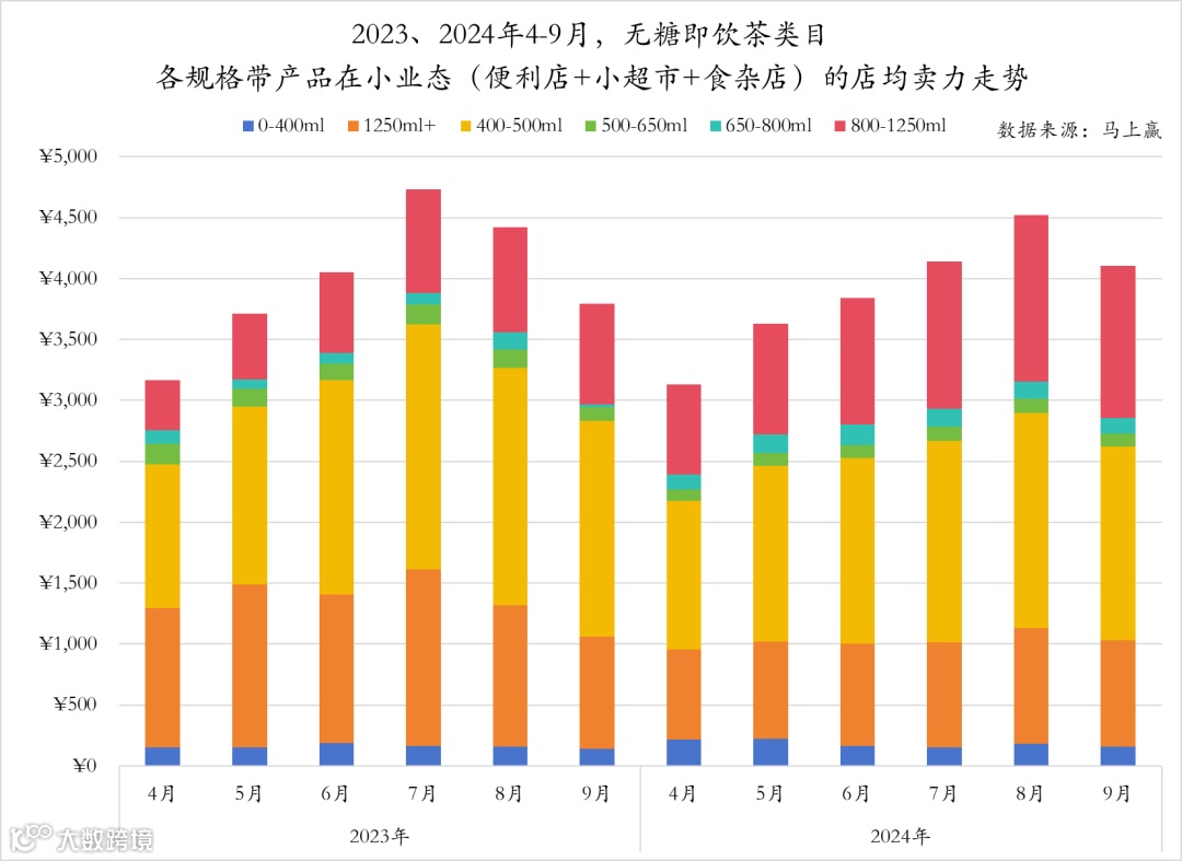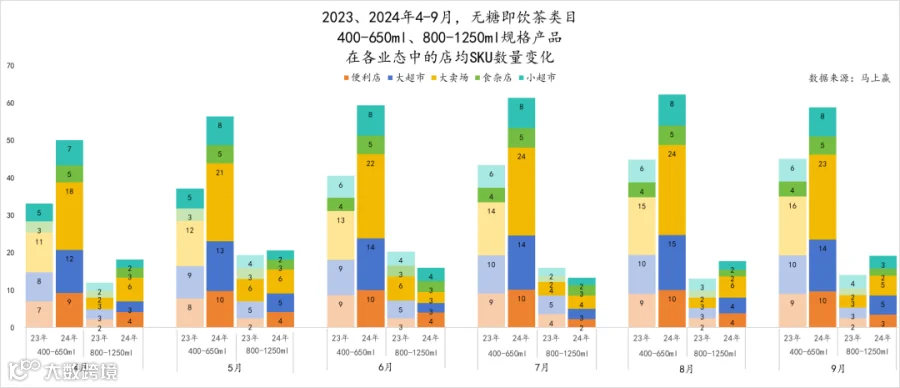 而整体来看,各业态下均分布有不同规格的产品,并未出现规格带的缺失,反映出不同业态内无糖即饮茶产品丰富度均较高。