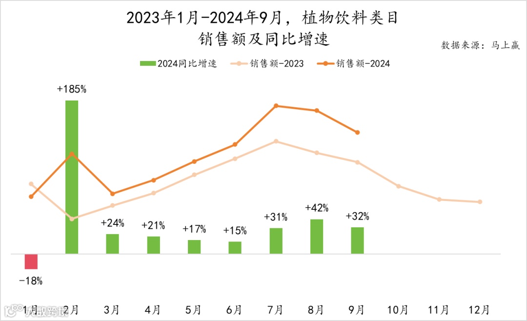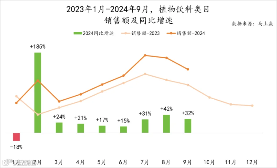同比来看,2024年3-9月期间,植物饮料的销售额同比增速始终维持在20%左右,并在8月迎来42%的同比增速峰值,增长势头较为旺盛。