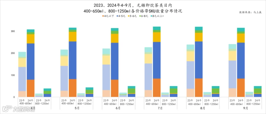 800-1250ml规格带SKU规模虽小,但同比2023年已有较大幅度的增长。在该规格带内部,市占率最高的6-8元价格带内相应也有较多的SKU,同样,处于4-5元、8元以上价格带的SKU也不在少数。