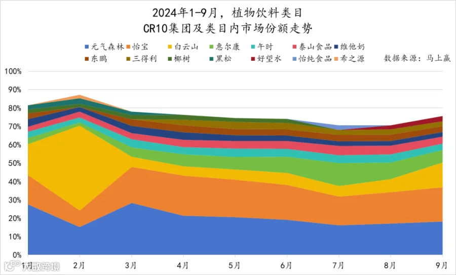 在植物饮料这一看似小众的赛道里,其实已经出现了诸多饮料类目下的头部玩家。可以看到在植物饮料类目内的CR10集团中,元气森林、怡宝等均多次出现且排名十分靠前。