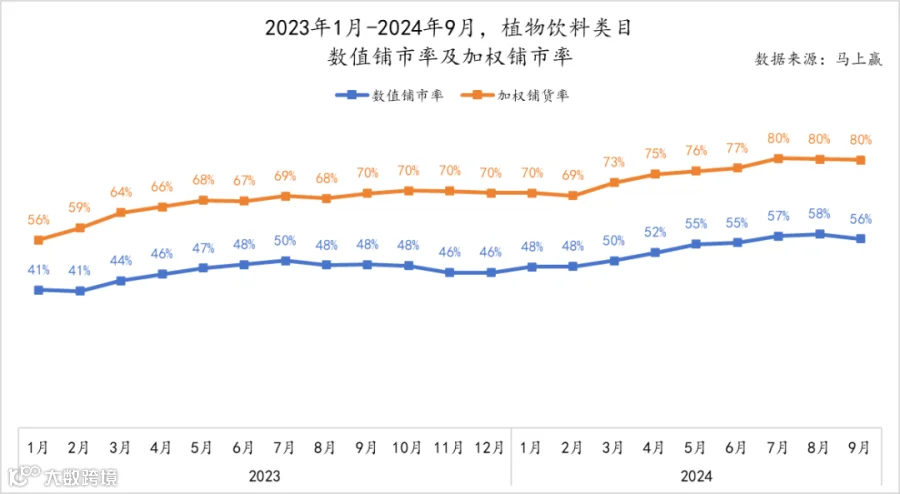 尽管植物饮料类目的市场份额在2024年增长较快,但其不到60%的数值铺市率依然有较大的增长空间。同样,就加权铺市率而言,植物饮料的80%左右对比无糖即饮茶的99%也仍有较大差距。
