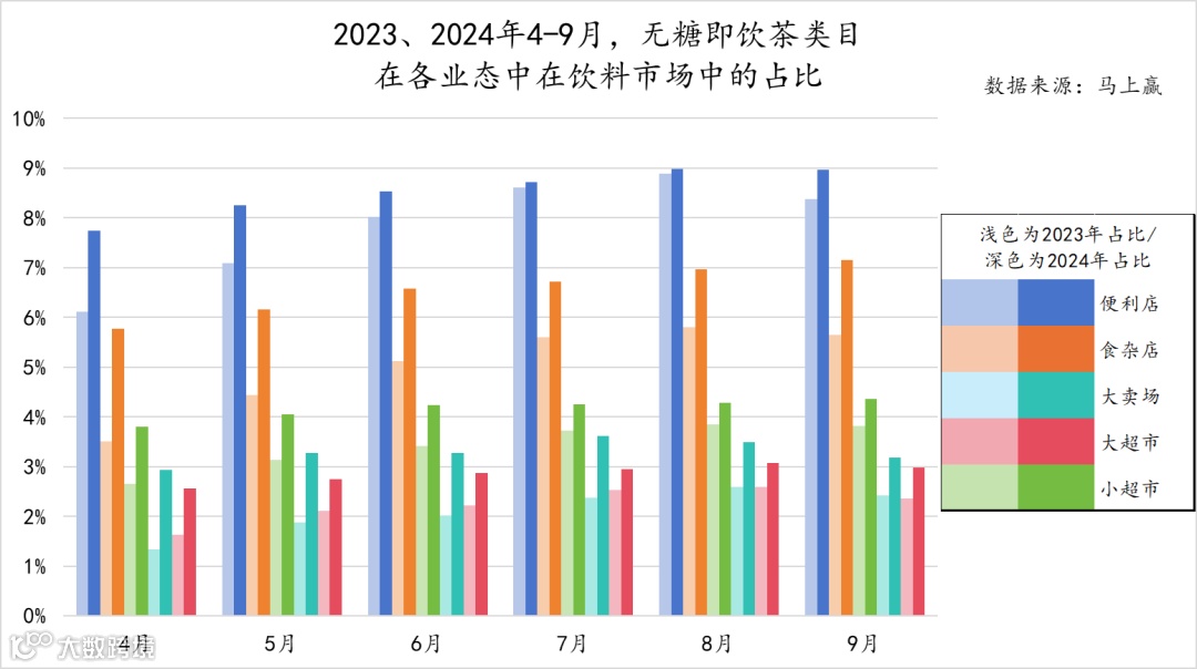 而在同为小业态的食杂店中,无糖即饮茶类目的占比在相对较高的情况下仍保持较快的增长。